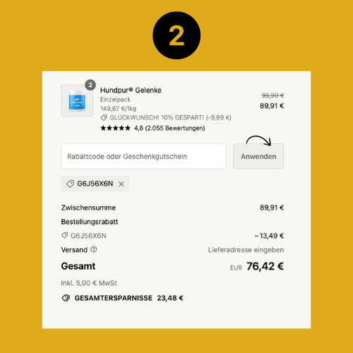Beim Bezahlvorgang gibst Du den Rabattcode in das dafür vorgesehene Feld ein. Anschließend wird der Rabatt automatisch vom Gesamtbetrag abgezogen.